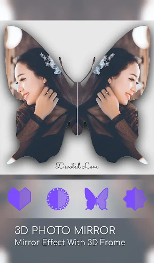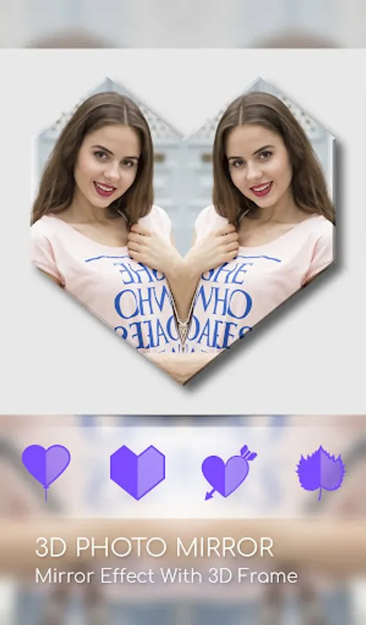 Quickly create the Mirror Photo and 3D mirror photo effect, 2D and 3D reflection effects allows you to make photo mirror effect. Create 3D photo mirror effects with using different types of 3D shapes and mirror reflection effects like heart, balloon, hexagon, rectangle, circle and much more.