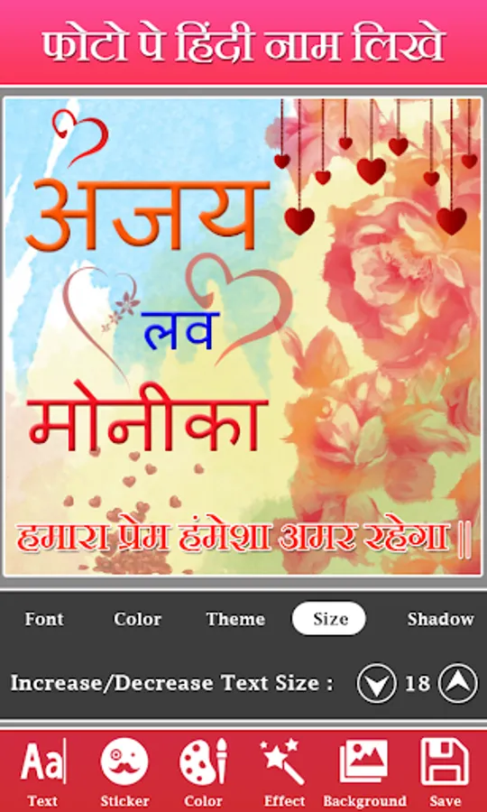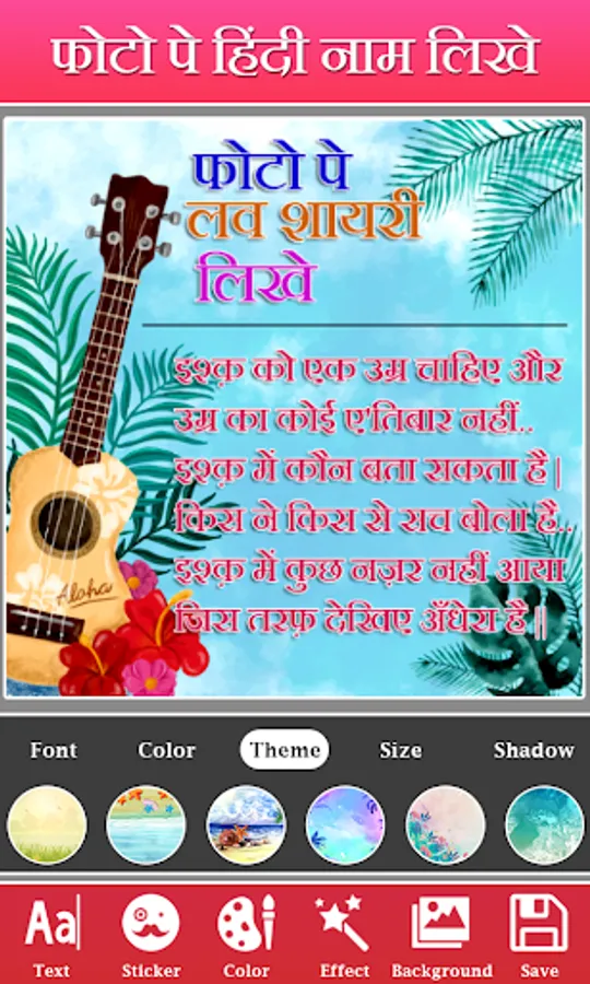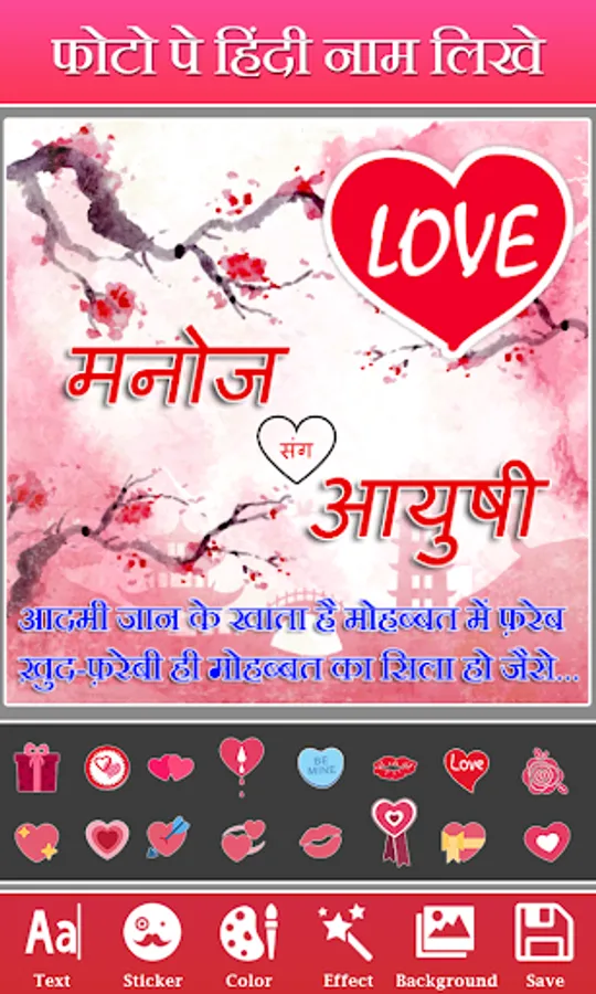 Photo Pe Naam Likhna app allow you add romantic Hindi text and hindi poetry on your gallery photos or on given rich collection of HD and stylish Background.