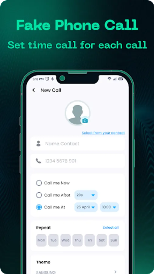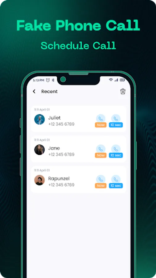 π The Fake phone call numbers app allows making your fake call extremely authentic. Choose from a variety of pre-recorded voices to simulate a real conversation, or even record your own custom audio to make it truly personal. Schedule the call to appear as if it came at the right time. Set the name and the image of the person you want to appear in the incoming call fake.
