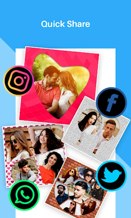 Montage all your selfies with the photo collage editor instantly. Shape photo collage Mixer creates amazing colleges for special days like Wedding, Anniversary, Birthdays, Valentine’s day.. Just choose your favourite photos and let the photo college maker do it’s magic. hundreds of templates and picture layout available to make a creative and amazing meme. Put your photos into grids or romantic hearts, photo grids are so useful. Beautiful photo grid and photo layouts suit all tastes.