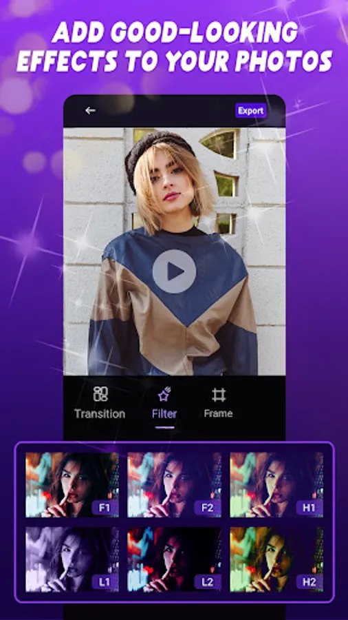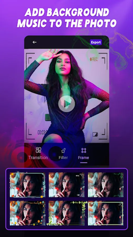 - Create videos from photos and music: choose your favorite photos, customize effect transitions, edit photos, add music from library or device, choose frames that fit the theme you create, add layers video overlays live layer effects