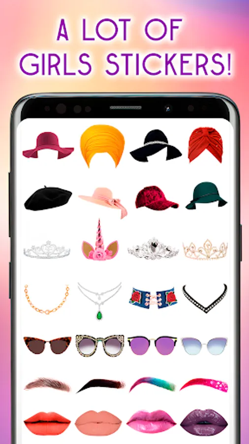 Also we have many woman beautiful makeup photo stickers like lips, eyebrows, woman hat, glasses to finish your hairstyle photo!