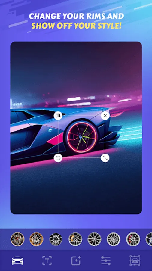 Elevate your car's appearance with our Rims Picture Editor·. Browse through a vast collection of wheel designs, materials, and sizes to discover the ideal match for your automobile. Simply select your preferred rims and preview them on your car in real time.