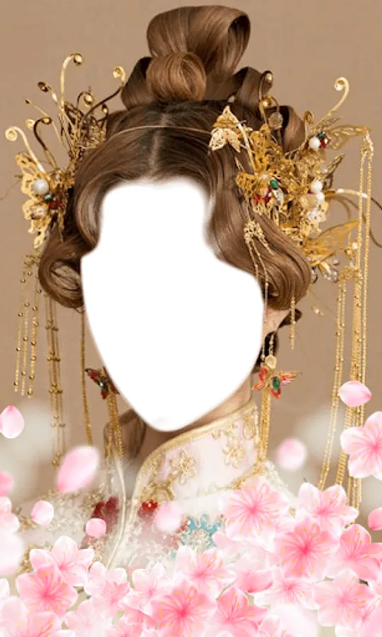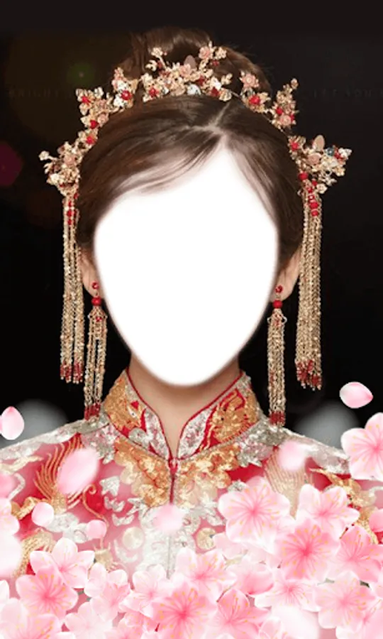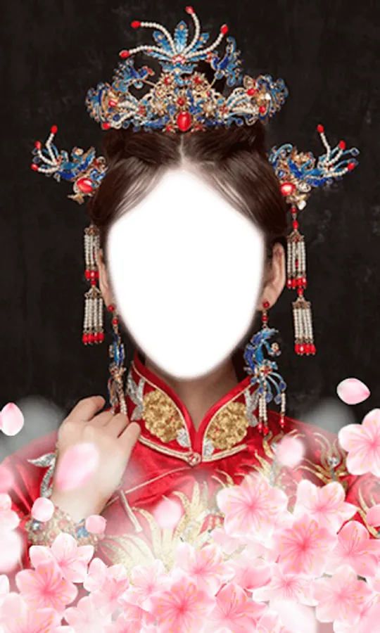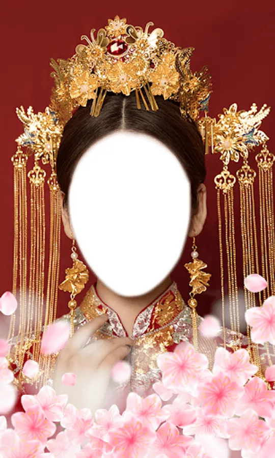 Use Chinese Wedding Headgear Montage to try on many elegant traditional Chinese gold phoenix crowns for bride. It is a perfect fit for Chinese Bridal Costume Headdress. Beautiful wedding jewelry hair accessories that goes well with ancient Chinese bridal costume that you can see yourself wearing immediately by placing your face hole in the photo frame montage maker.
