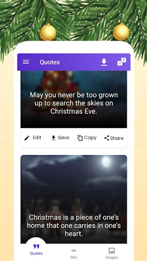 - Easy to add Christmas Gif, Christmas Images, Christmas Greetings Card, Christmas Wallpaper and Christmas Quotes into your favourite list.