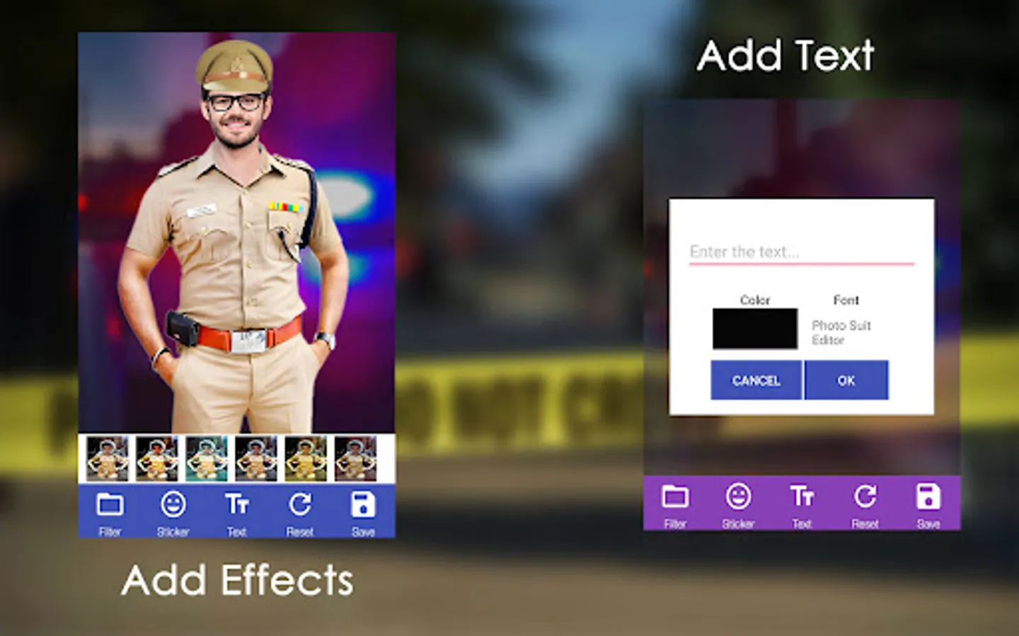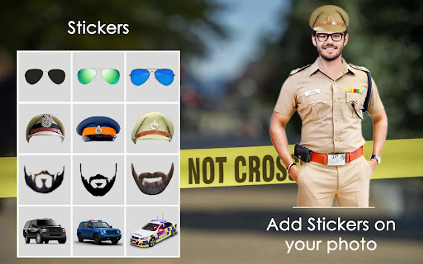 Share & save the captured photos of both men and women by adding police background & stickers!