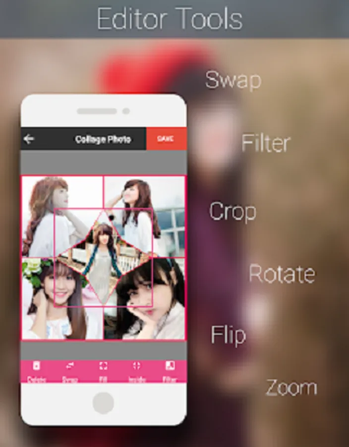 ♥ Collages Editor The camera includes over 60+ collage frame templates with photo grid, square, heart, star, enough for you to combine the photos the way that is the most beautiful.