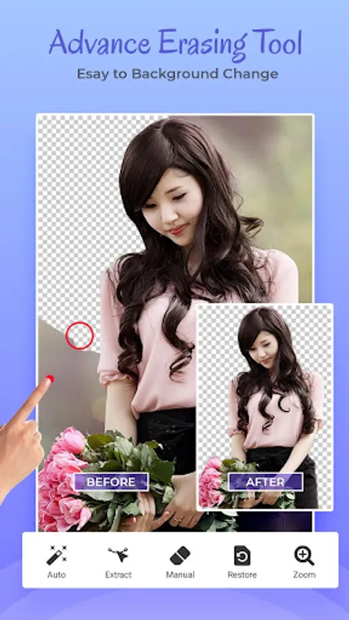 5) Multiple erase tools to remove photo background - Auto Background Eraser , Extract Mode, Manual Cut Paste Photo , Restore Functionality, Seamless Merge to other backgrounds.