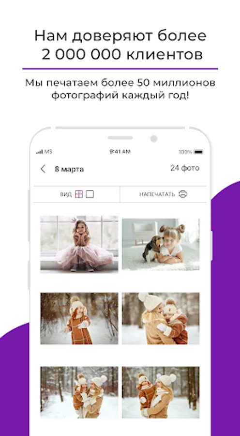 Print photos from any source: smartphone gallery, Google Photo, Vkontakte, netPrint albums.