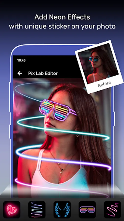 Neon Effect : Try neon effects on your photo and see magic yourself. User different shapes and wings style neon effects and make your photo more beautiful and amazing.