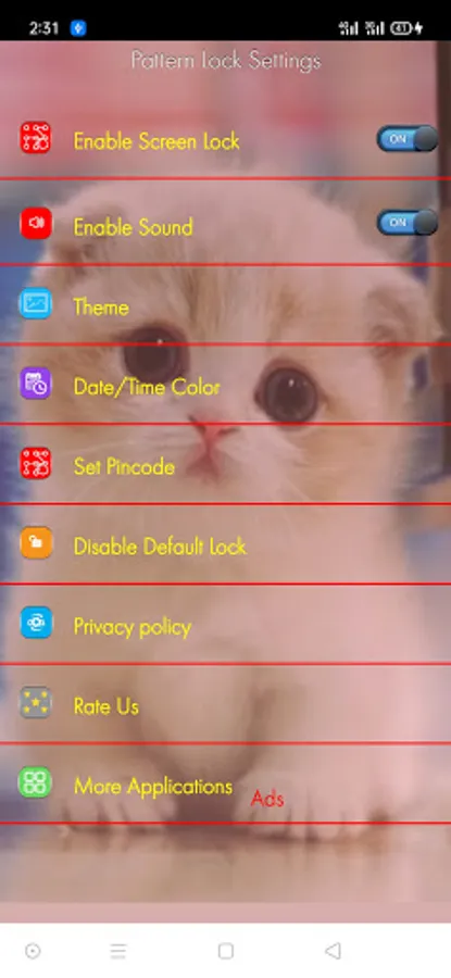 1. Open the cute kitty cat pattern lock screen password app settings, and tick the Enable screen lock check box to enable it.