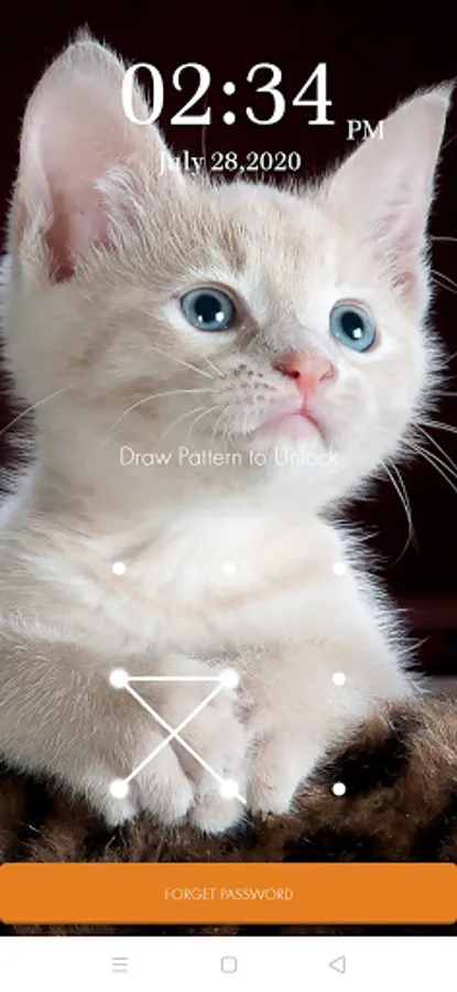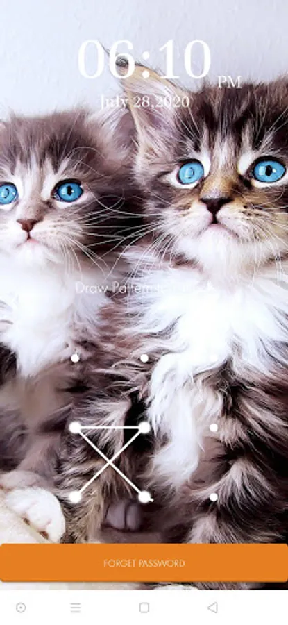 You can enable lock screen and disable the pattern screen lock from settings. You first have to set a cute kitty theme unique pattern password for your phone. You have to drag your finger along at least four dots and set the photo pattern lock screen and use it every time you wish to unlock your phone. No abuse of personnel data is possible with this cute kitty wallpaper Kitty Cat Pattern Lock Screen