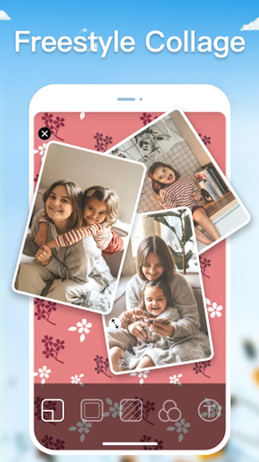 If you don’t want a normal photo layout, you can also choose free collage, customize personal photo designs. Choose the background and photo you like, you can adjust the position and size of the photo at will, and you can also decorate the photo with stickers, text, doodles, etc.