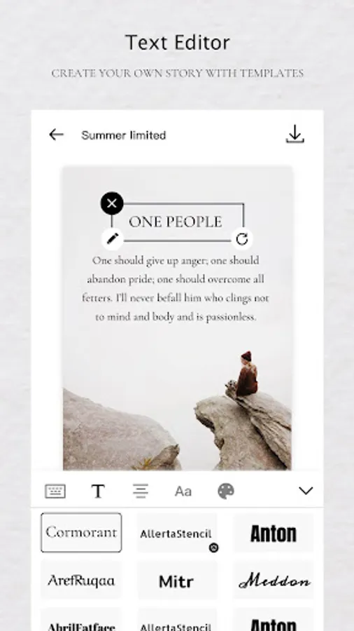 · There are multiple font types. When editing photos, you can choose different type fonts, customize the font size, color, format, and then write your mood and thoughts on photos.