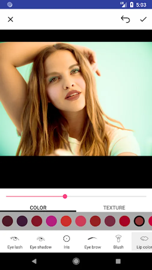 - Lipstick changer: different lip stick colors allows you to make up your lips in case you forgot to apply lipstick before taking photos.