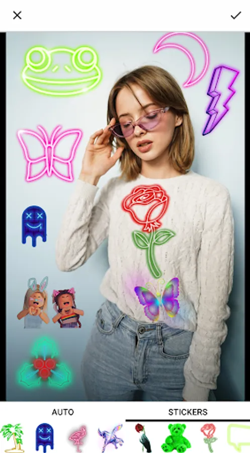 We also have some popular neon stickers with neon glasses, glossy lips, shiny mustaches, glow effect whiskers and more. There are crown stickers with halo effect crowns, neon light crowns, neon light filter hoops, light hats, bright cat ears and more. Next, there are Cafe stickers that have neon light effect cafe and restaurant signs, neon fruit, neon Animal stickers that have all sorts of “neon effect” animals, such as neon elephant, neon butterfly, wolf and more.