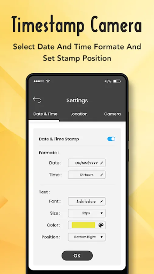 Settings here you can done by your preferences, you can change font, time-stamp position, photo name, change it easily.