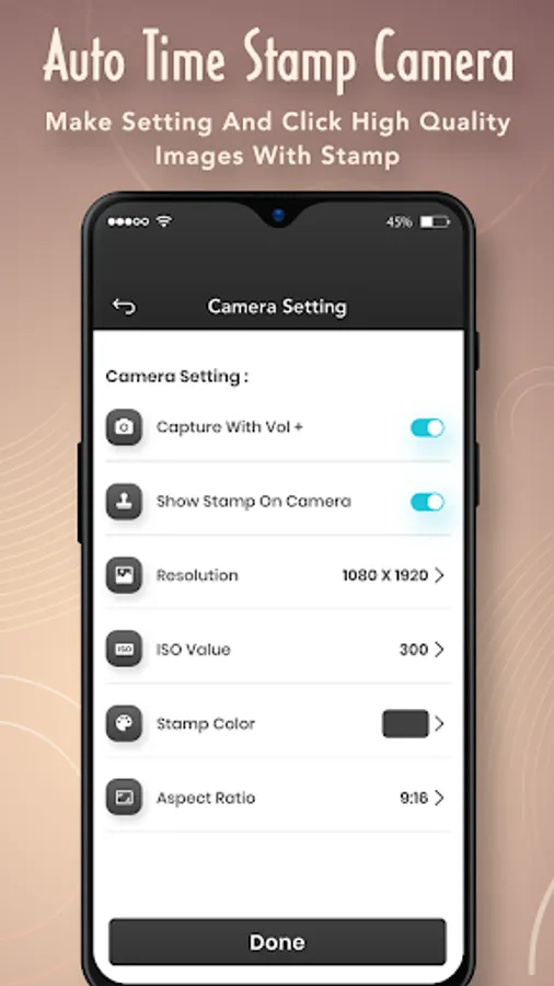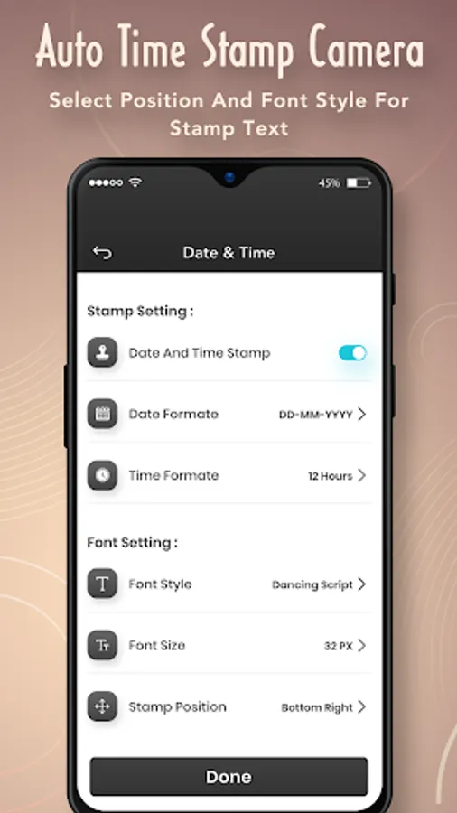 - Save all time-stamp photos on your SD Card or Phone Gallery.