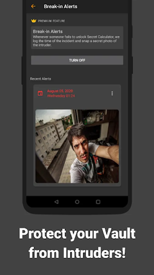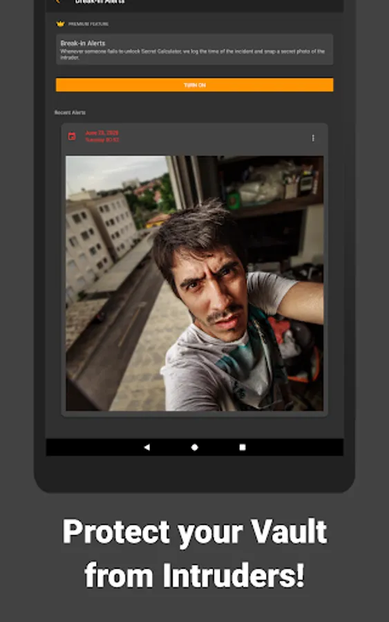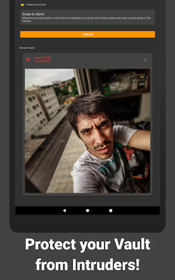 🕵️ Break-In Alerts - Keep safe your private photo vault from intruders with Break-In Alerts. Whenever someone fails to unlock Secret Calculator, we log the time of the incident and snap a secret photo of the intruder.