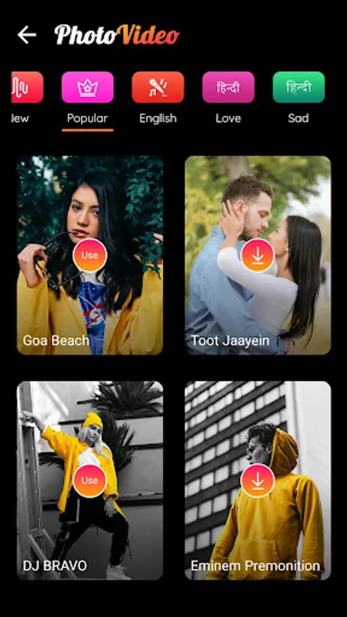 Photo Video Maker with Song app let's you easily create videos with your own photos, add your favorite music track, write text or name, apply various frames, apply color effects.