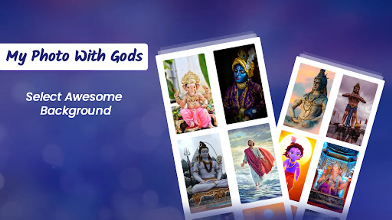 Gods photo background changer gives a huge collection of gods backgrounds like Lord Shiva, Hanuman, Lord Ram, Ganesha, Buddha, Krishna, Goddess Kalika, Lakshmi, Jesus, Sai Baba, Lord Swaminarayana, Lord Vishnu and many more.