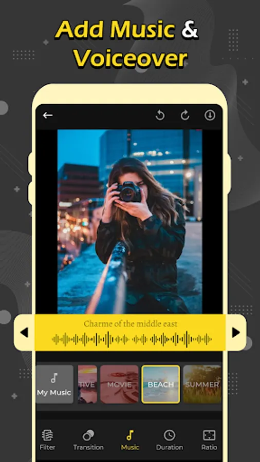 Add the best music or songs to make a photo video and photo slide shows. With this photo slideshow maker app, you can make photo videos within a few minutes and then add music or songs into it.