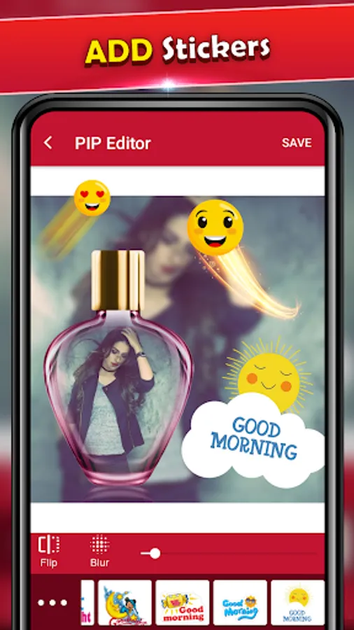You may use PIP Photo Editor to add text and stickers to your unique images.