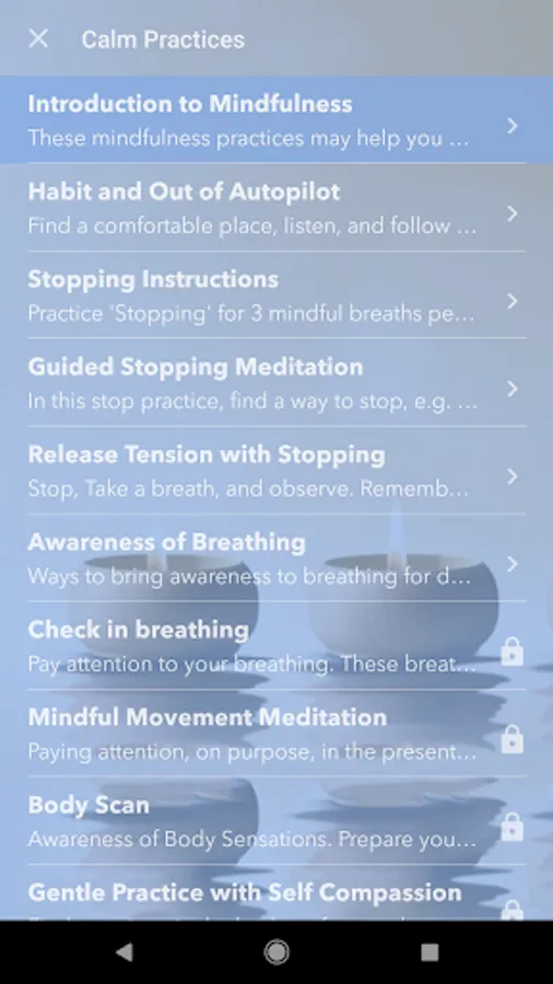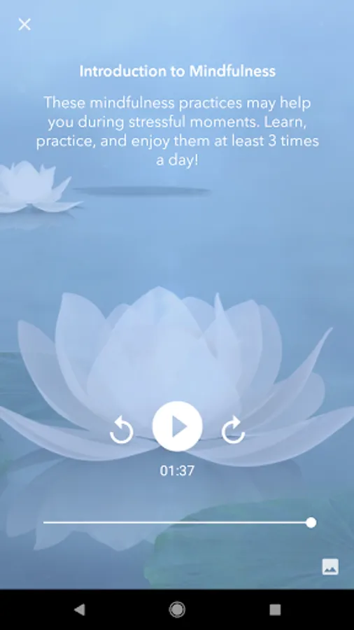 The calming practices of the app feature an introduction to mindfulness and short exercises that can be followed daily. Each practice provides voice instructions with soothing background video and music. The mindfulness exercises were developed by Renée Burgard, LCSW, Mindfulness & Health.