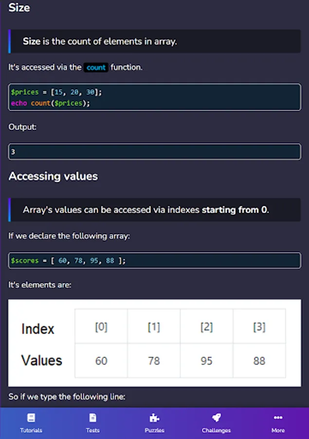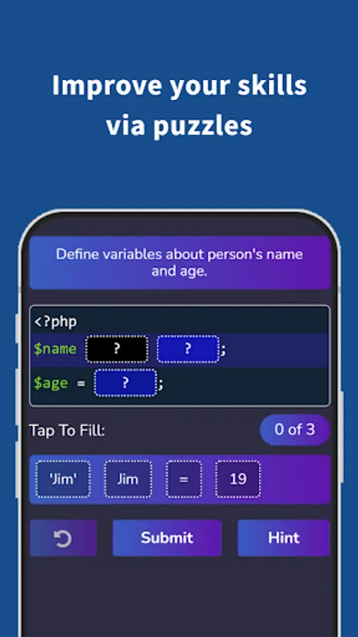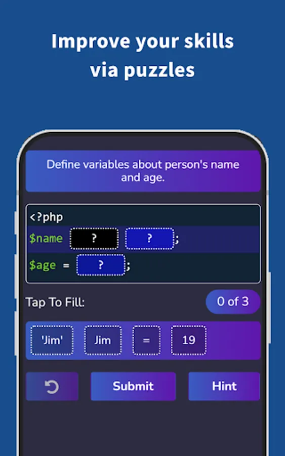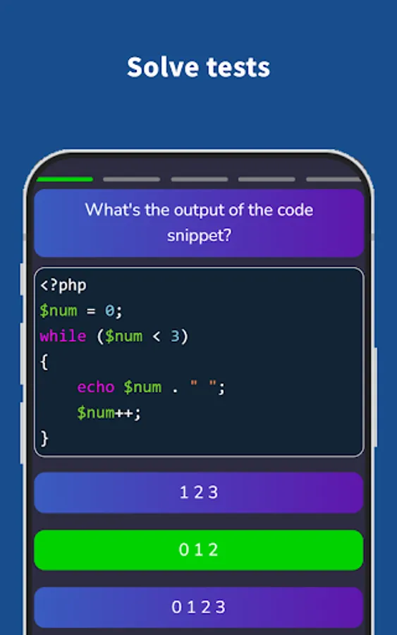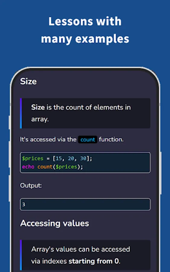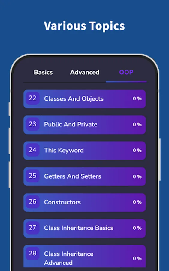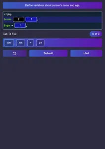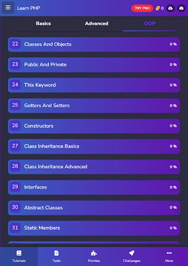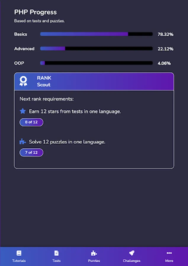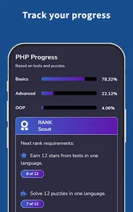 The app provides gamification UI to make your PHP learning experience awesome. Each PHP task you complete will get you closer and closer to becoming a PHP developer. It doesn't matter if you are a beginner starting his/her PHP coding journey or you're experienced learning OOP - Object oriented programming in PHP.