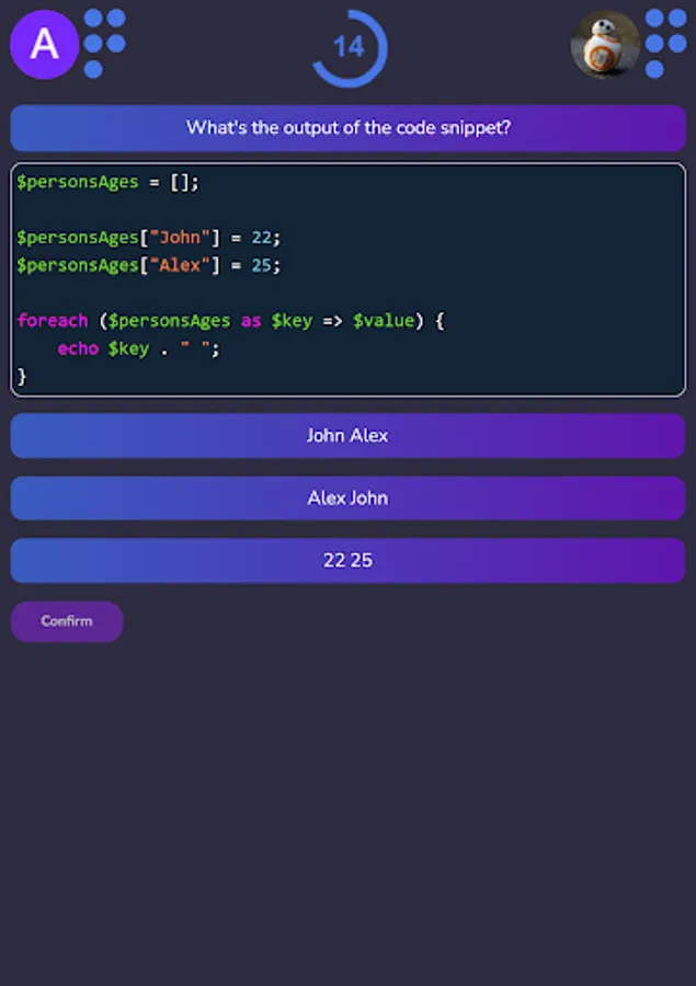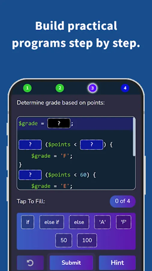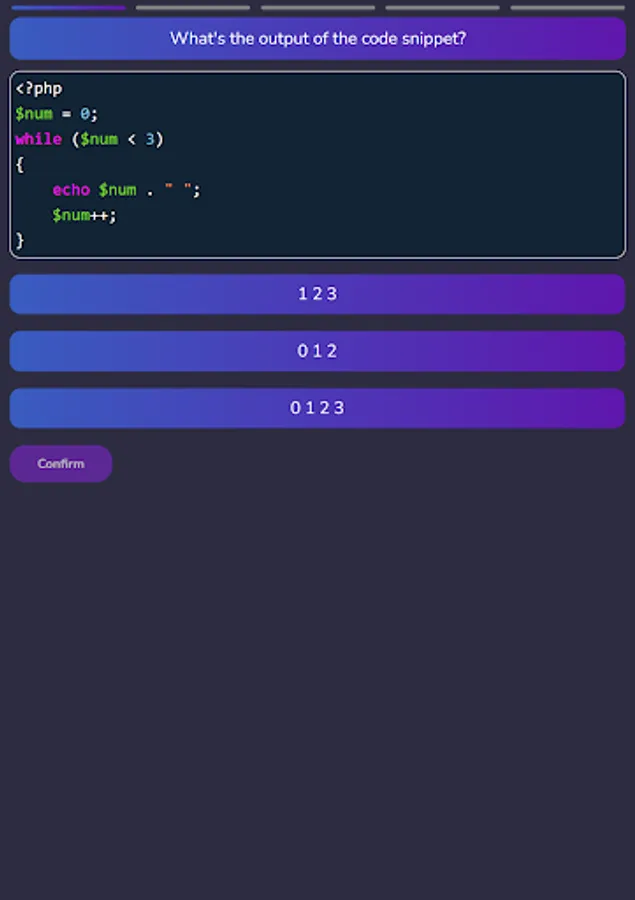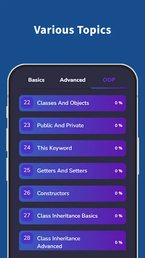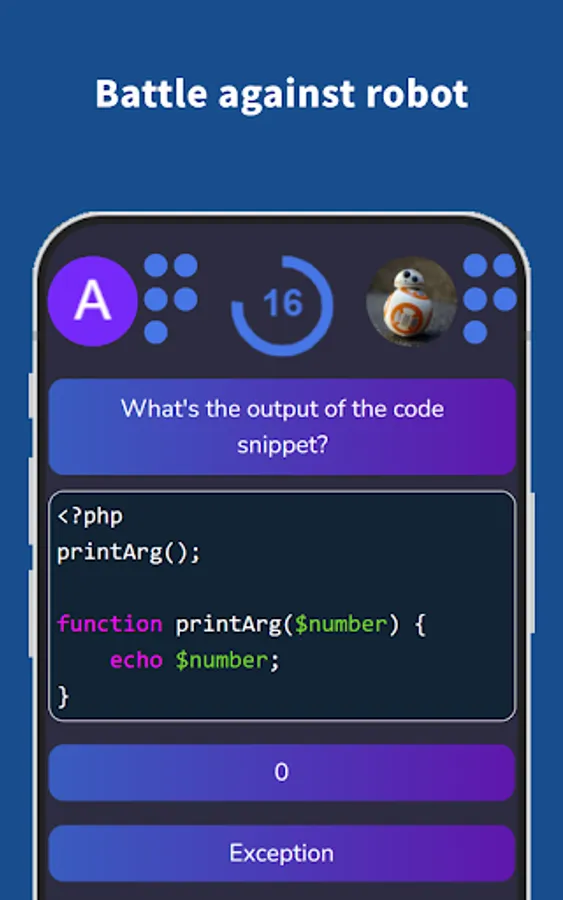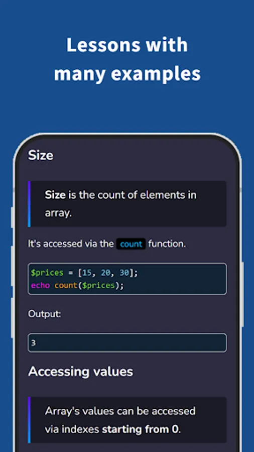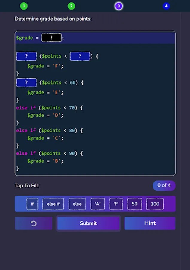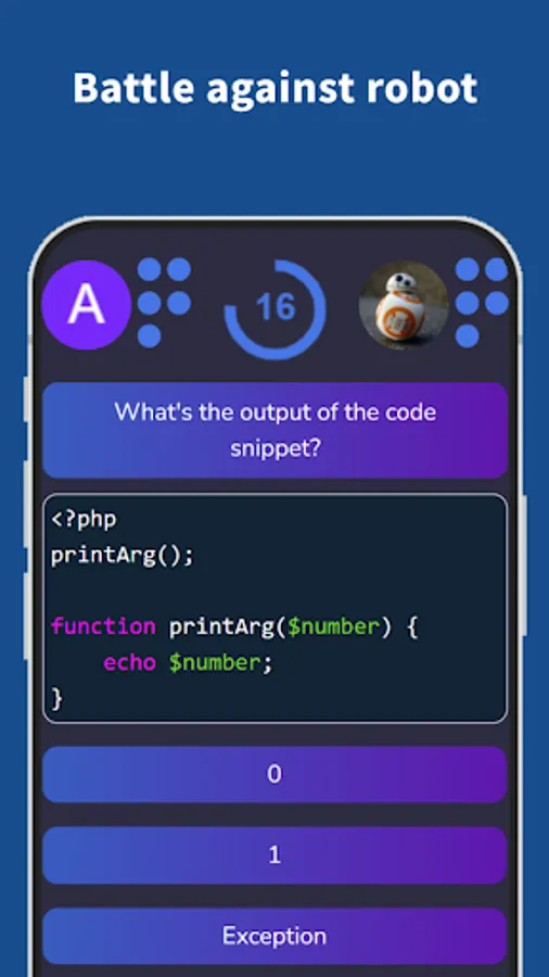The app provides gamification UI to make your PHP learning experience awesome. Each PHP task you complete will get you closer and closer to becoming a PHP developer. It doesn't matter if you are a beginner starting his/her PHP coding journey or you're experienced learning OOP - Object oriented programming in PHP.