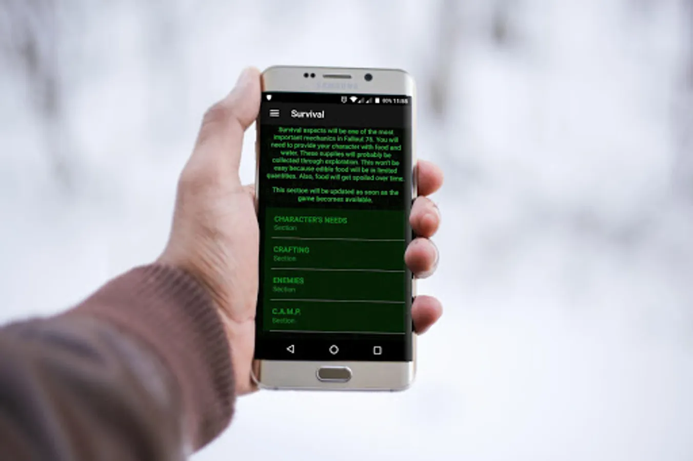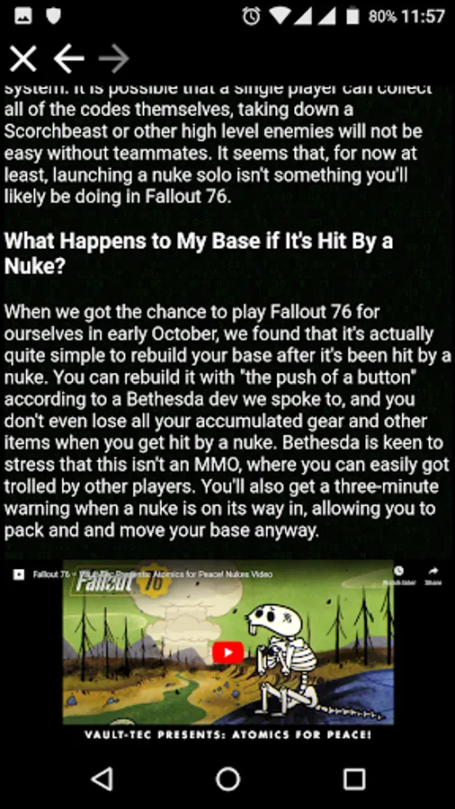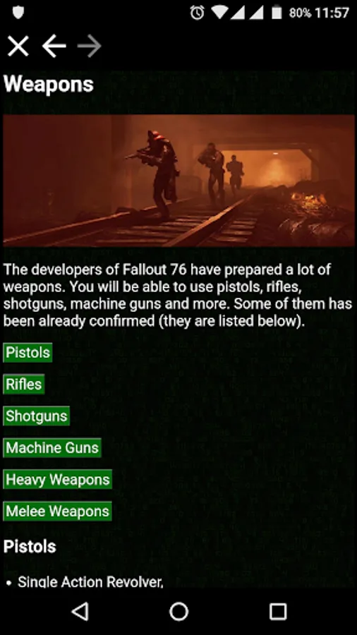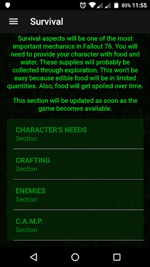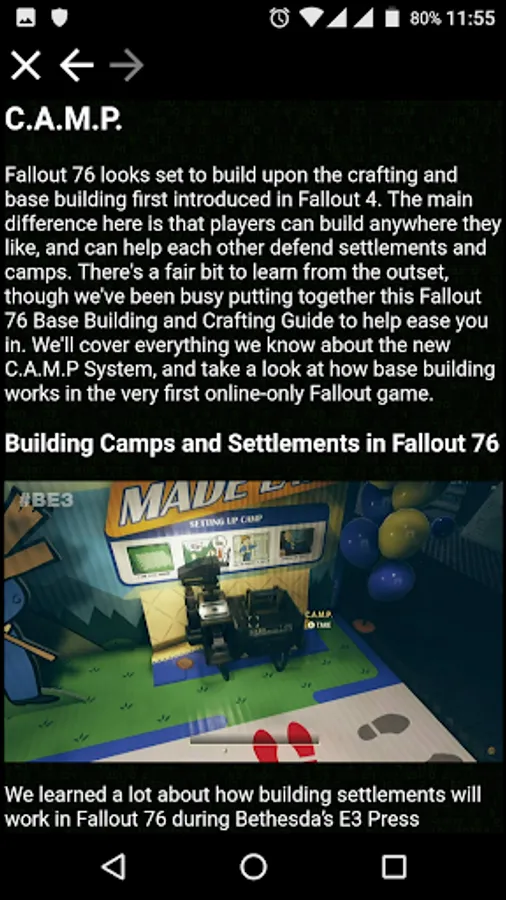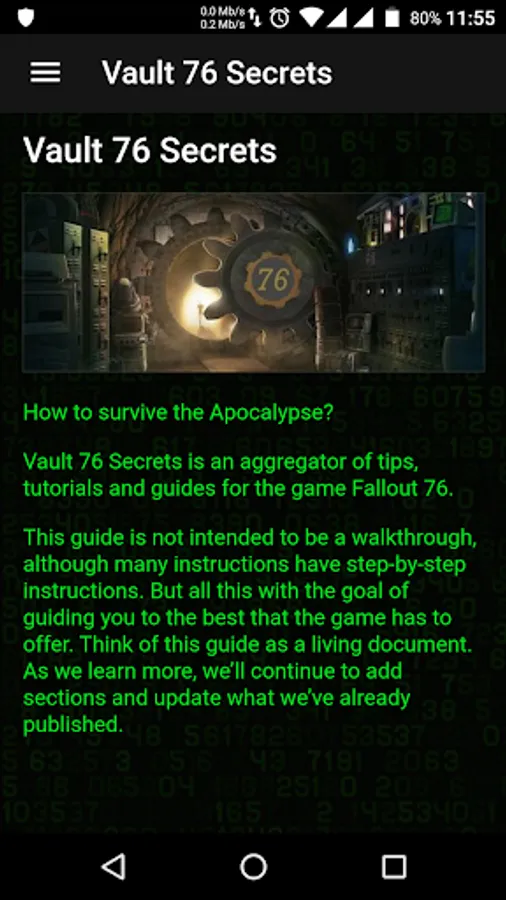 This app contains guides, tutorials and tips on how to complete the activities of the Fallout 76 Game, and get the best equipment and rewards, without use cheats or exploits.