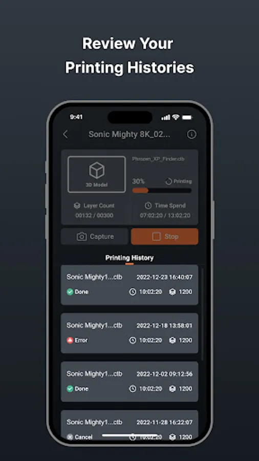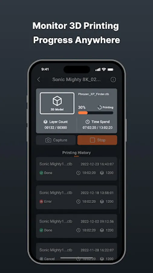 Phrozen GO is designed for Phrozen 3D printer users so they can always check on their Phrozen 3D printers wherever, whenever.