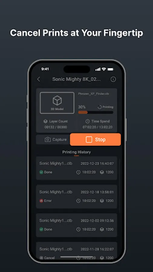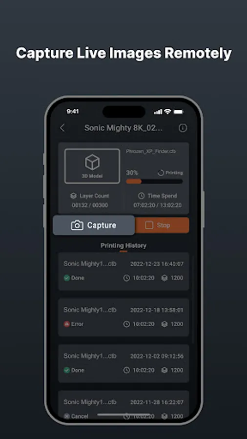 Remote Printing Control: take pictures, monitor your printing progress, or stop your prints anytime, anywhere.