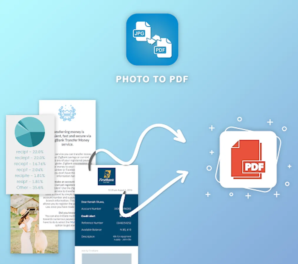 Photos to PDF Converter create the PDF document with multiple photos and images. App to convert images to PDF. No watermarks.
