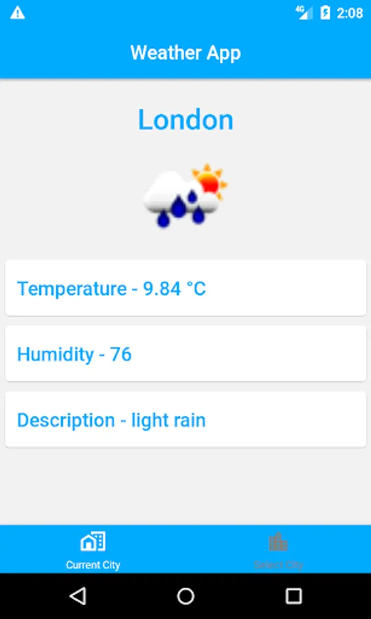 check weather conditions before leaving home . This is simple weather app which will give you current weather conditions in your city.