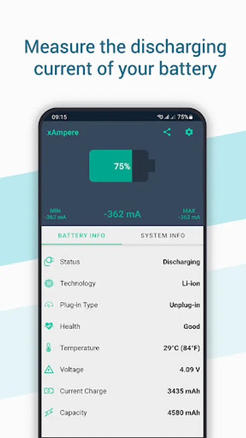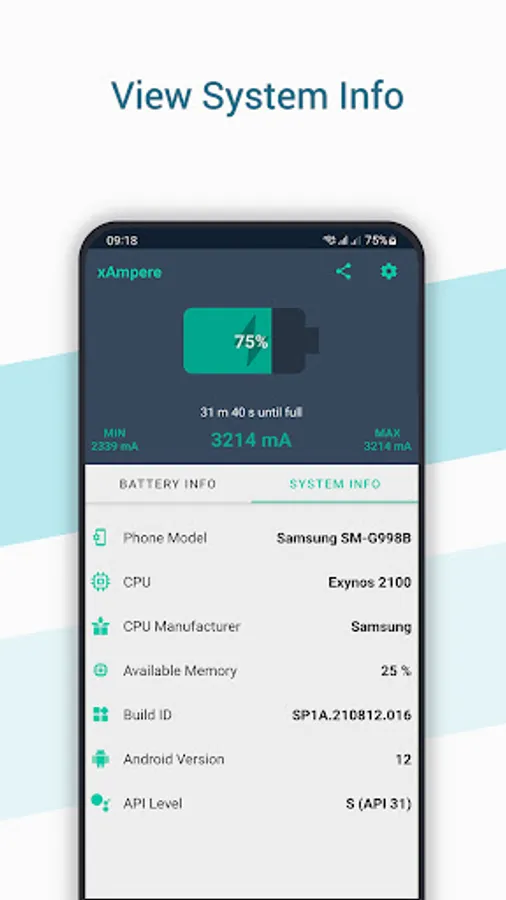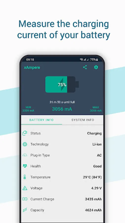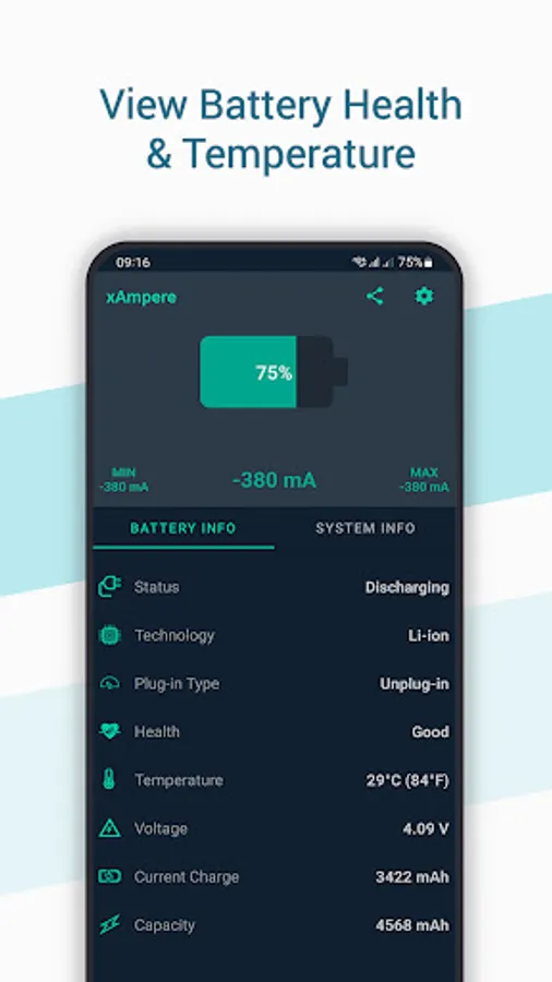 - In Battery Info Tab: Battery charging level, battery health, voltage, temperature, battery technology, battery capacity, battery current capacity
