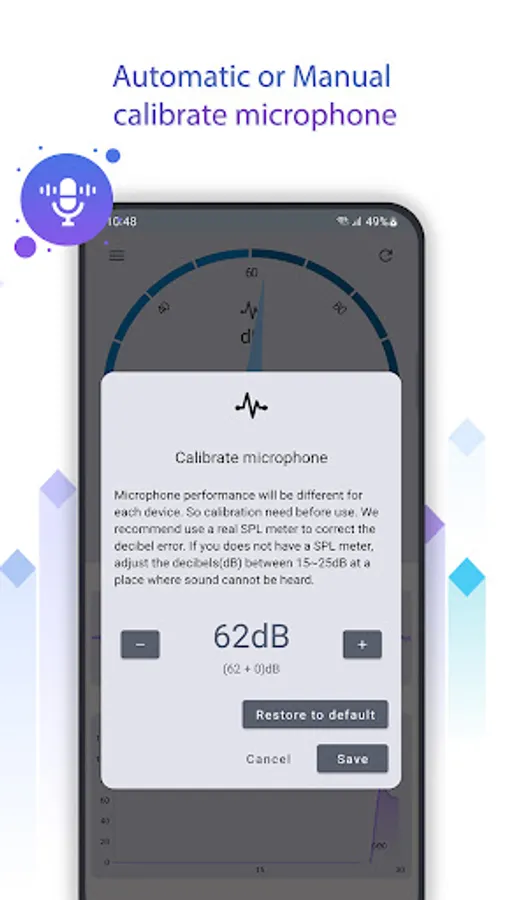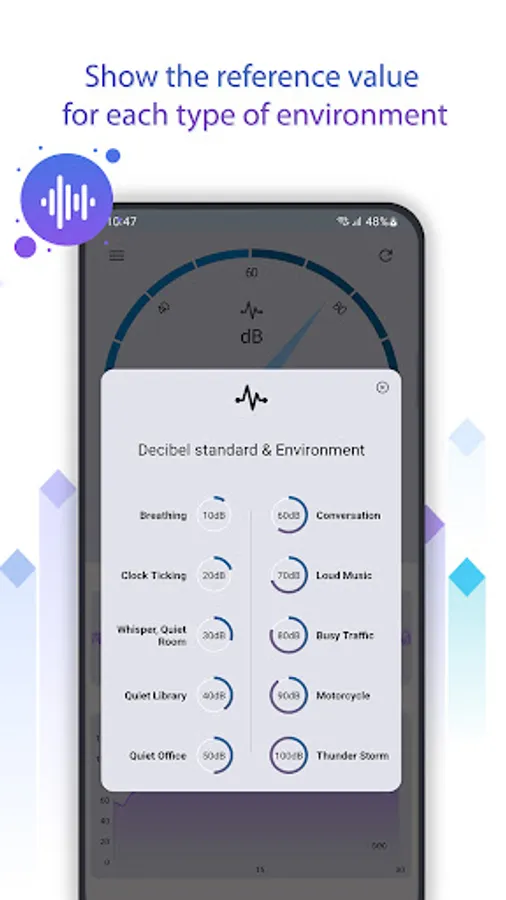 Sound Meter - Decibel Levels will use the phone microphone to measure environmental noise decibels (dB) and show a value for reference.