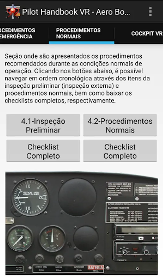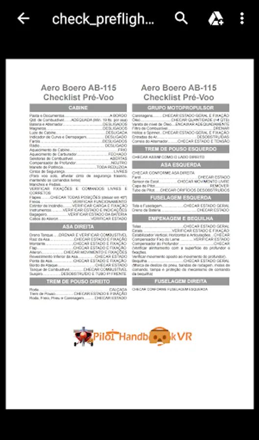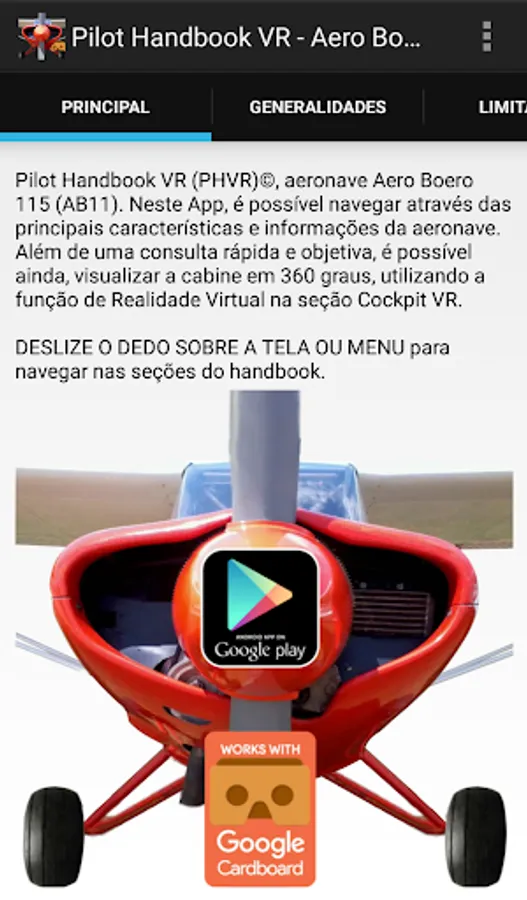 The Pilot Handbook VR for Aero Boero Aircraft, is a tool, developed for Android devices, which consists of a pocket electronic handbook, that allows audiovisual resources of interactivity, including sliding screens and Virtual Reality (VR).