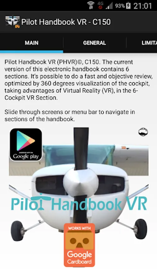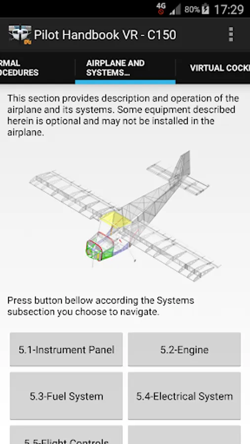 (includes Virtual Panel and complete description in PDF); Engine (includes the complete description of engine commands and instruments, and its systems); Fuel System; Electrical System (includes the complete description of electrical system, and its instruments and gages); Flight Controls System; Brakes System; Ground Control System; Wing Flap System; Cockpit VR; *monoscreen visualization (gyroscope sensor improves this function, however, it's not mandatory); *stereoscreen visualization (requires gyroscope sensor).
