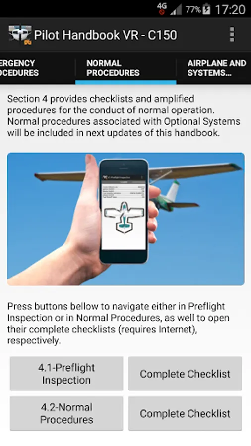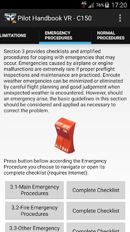 In current version you have: General; Limitations; Emergency Procedures; Main Emergency Procedures; Fire Emergency Procedures; Other Emergency Procedures (includes Complete Checklists); Normal Procedures; Preflight Inspection; Normal Procedures