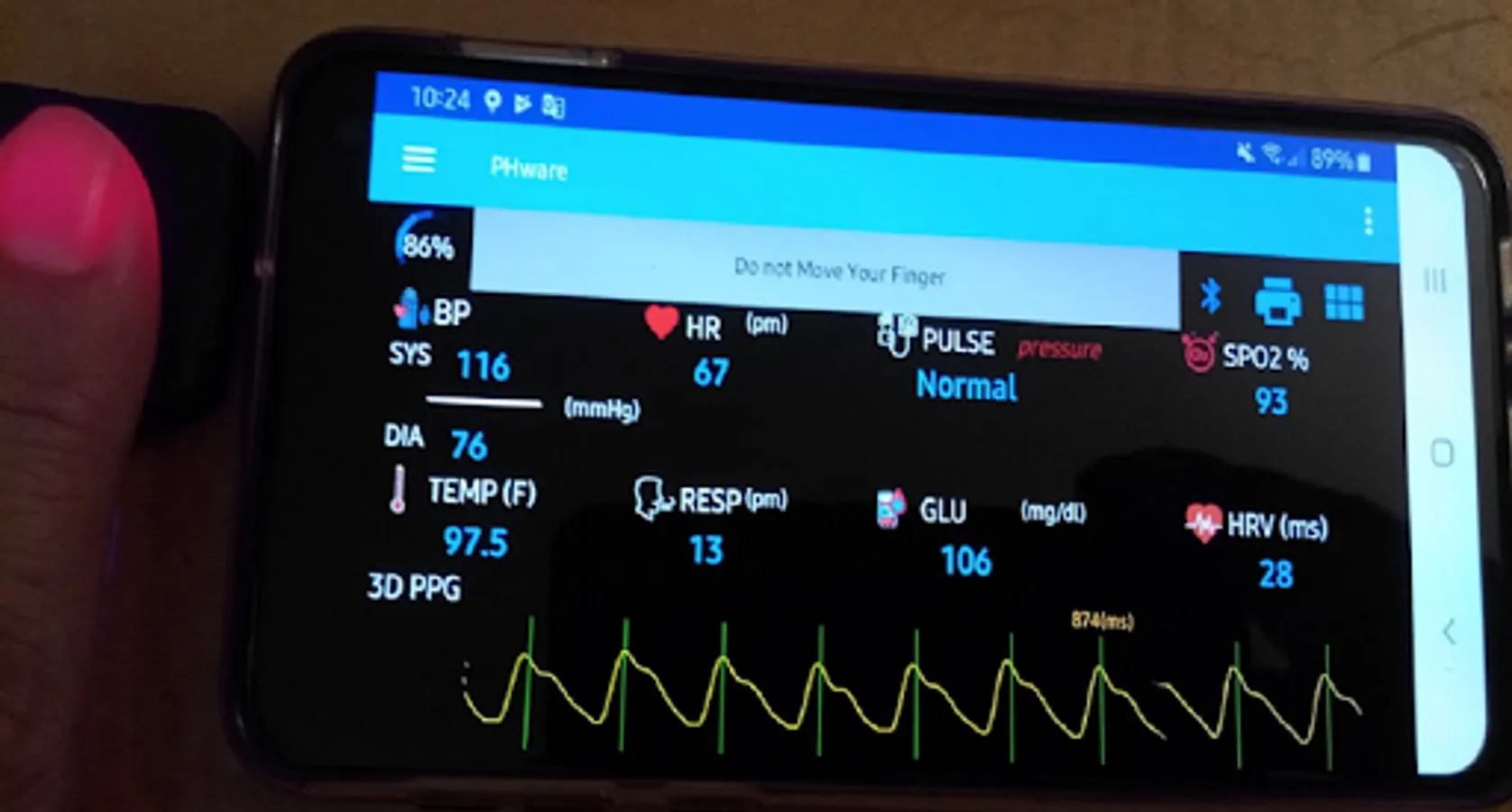 PHware© App when used with Phware Sense© devices such as Phware Sense nano, Phware Sense tablet and Phware sense mobile, provide the most comprehensive noninvasive system that measures all major vital signs including blood pressure, glucose, temperature, respiration, pulse, blood Oxidation and heart rate variability (HRV) without cuff/pump or finger pricking.
