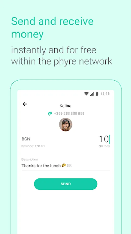 • send money instantly and with no fees within the phyre network