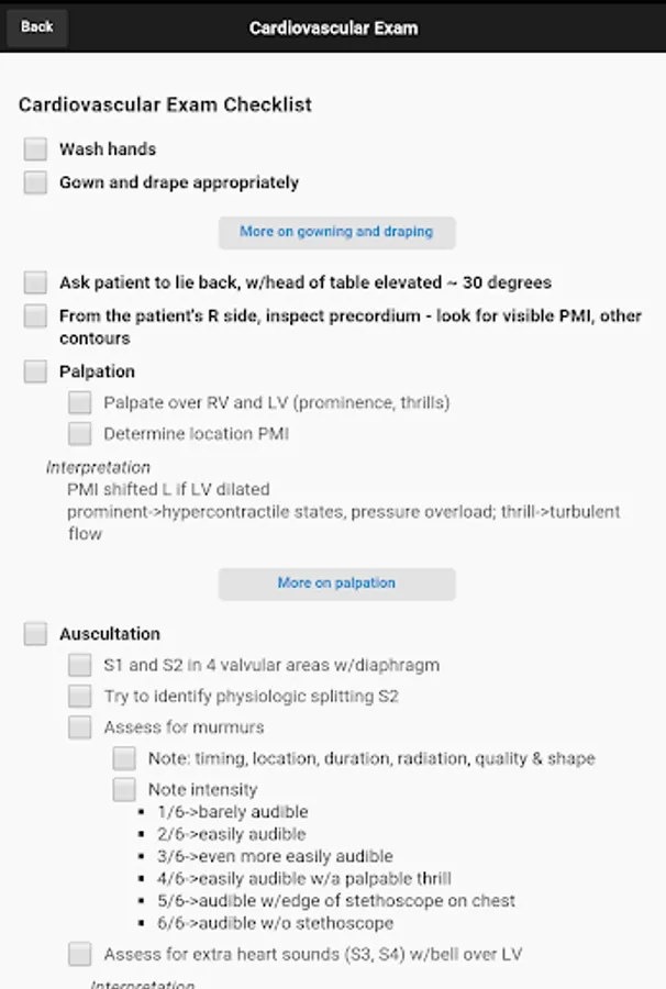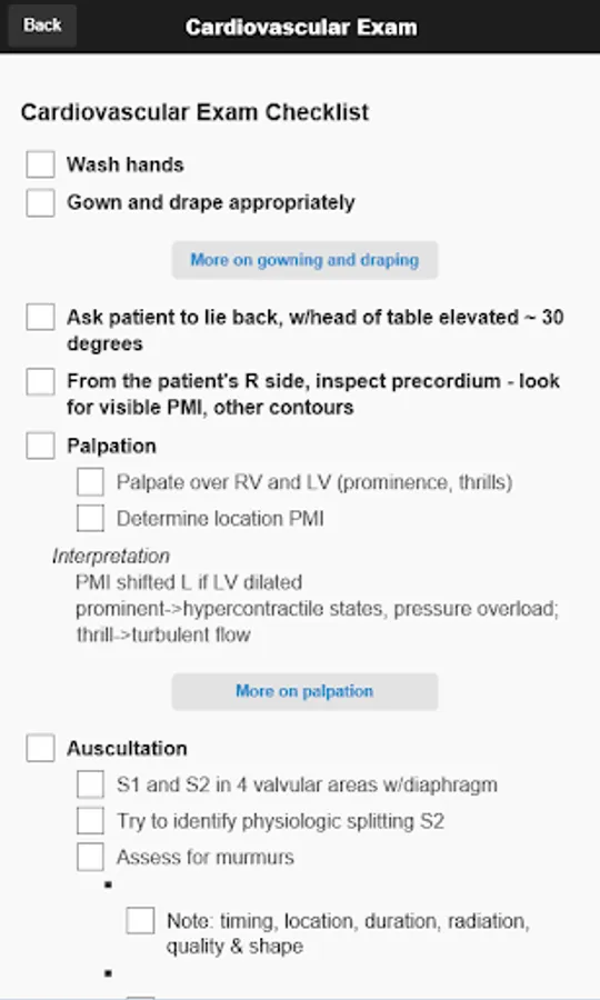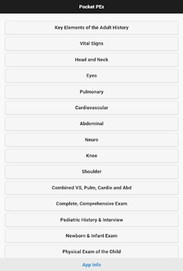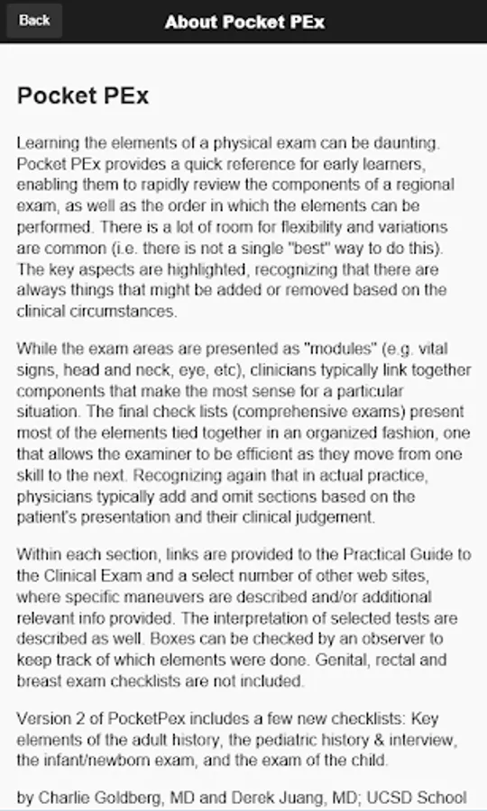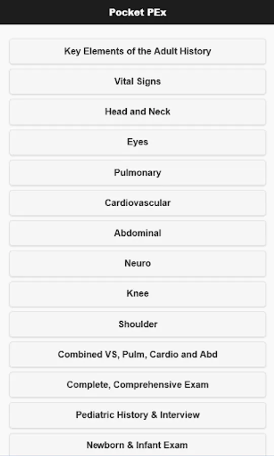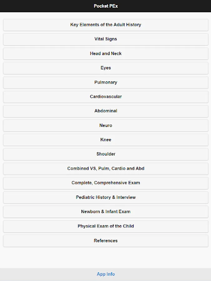 Learning the elements of a physical exam can be daunting. Pocket PEx provides a quick reference for early learners, enabling them to rapidly review the components of a regional exam, as well as the order in which the elements can be performed. There is a lot of room for flexibility and variations are common (i.e. there is not a single "best" way to do this). The key aspects are highlighted, recognizing that there are always things that might be added or removed based on the clinical circumstances.