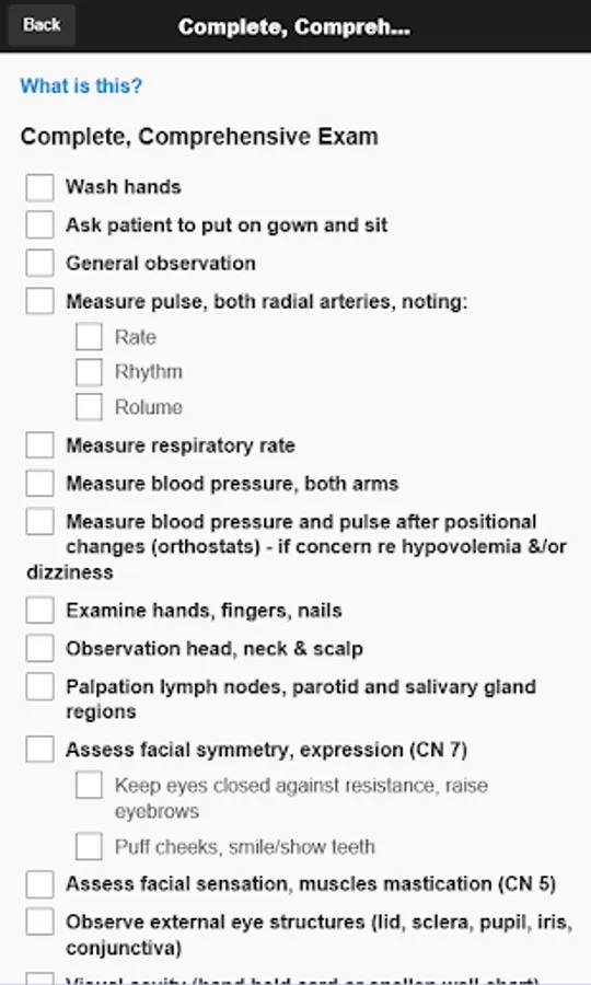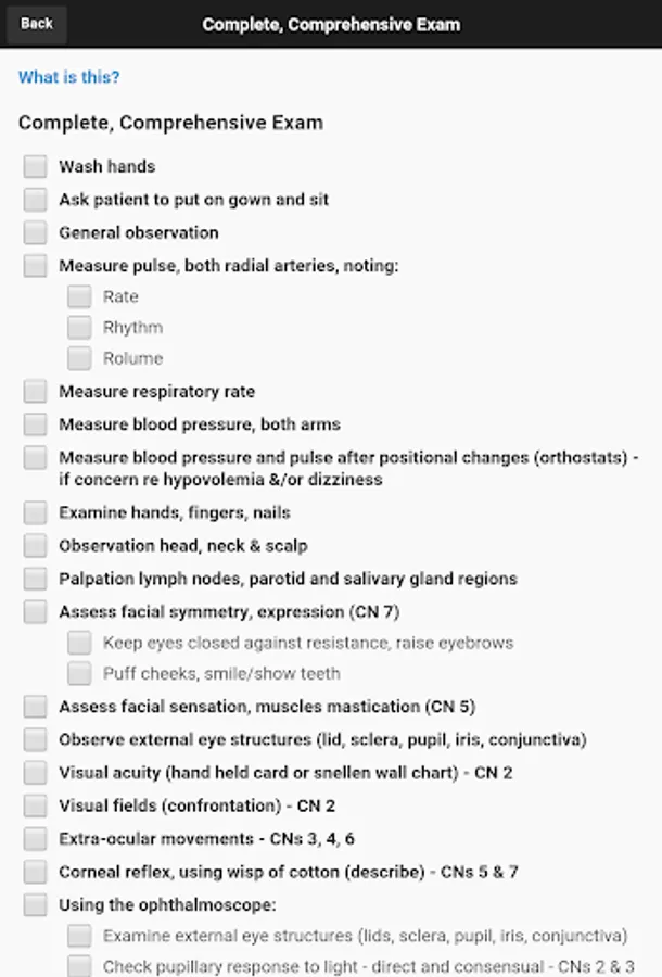 While the exam areas are presented as "modules" (e.g. vital signs, head and neck, eye, etc), clinicians typically link together components that make the most sense for a particular situation. The final check lists (comprehensive
