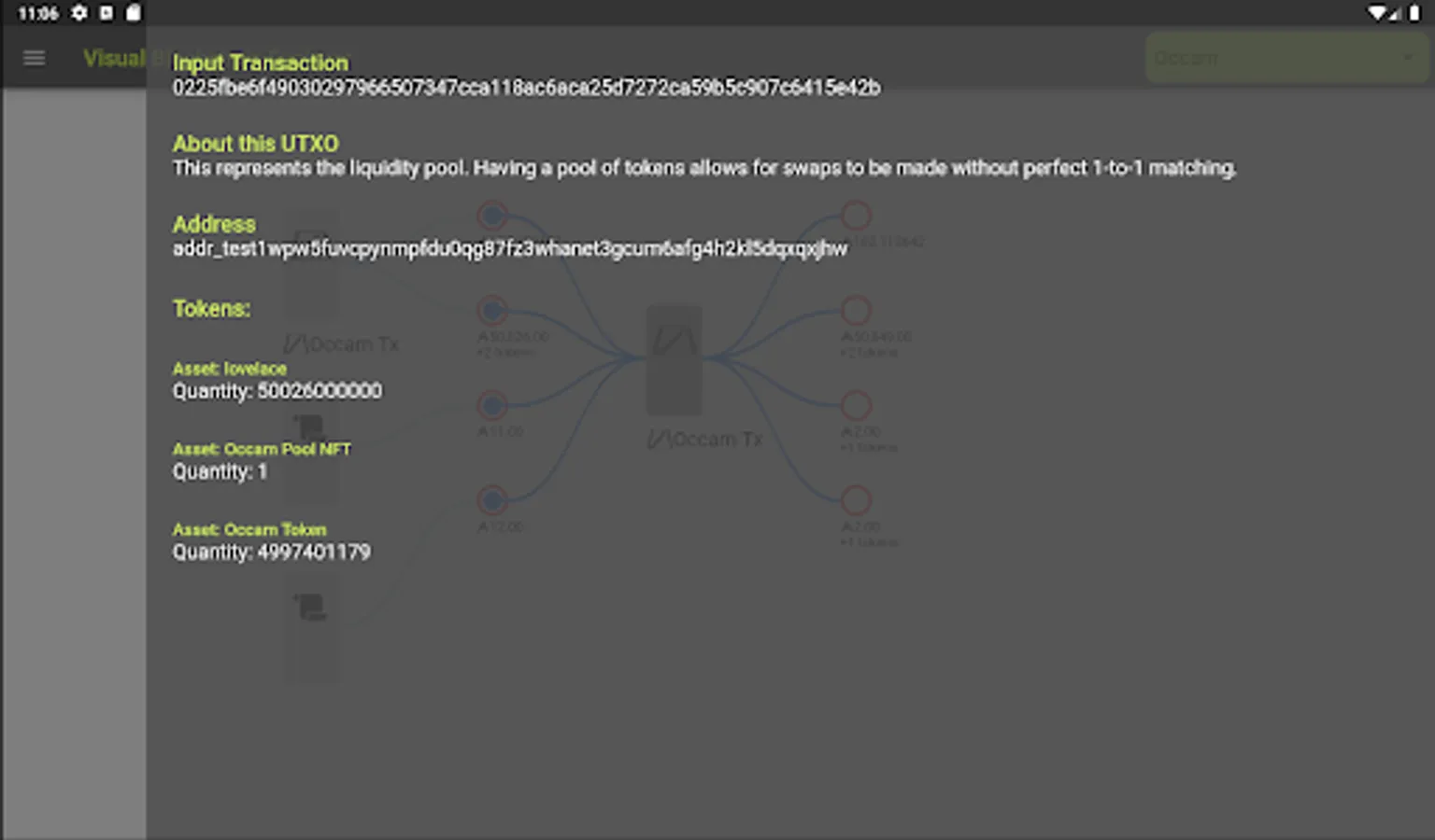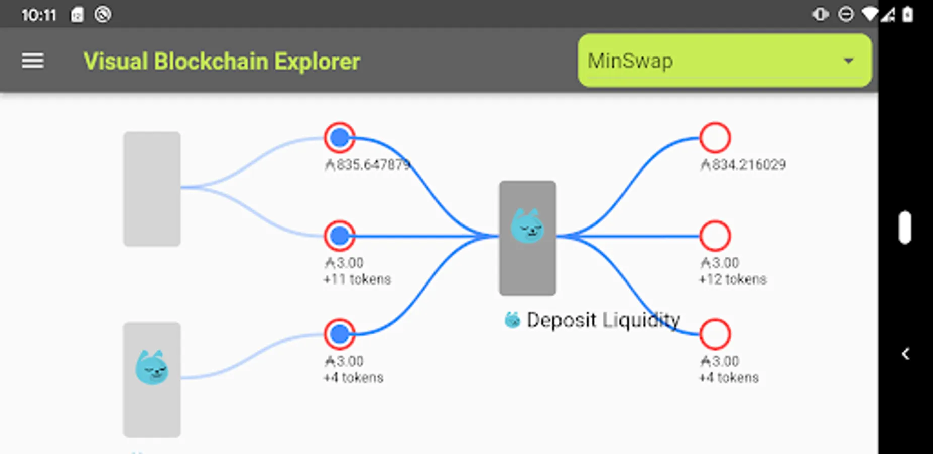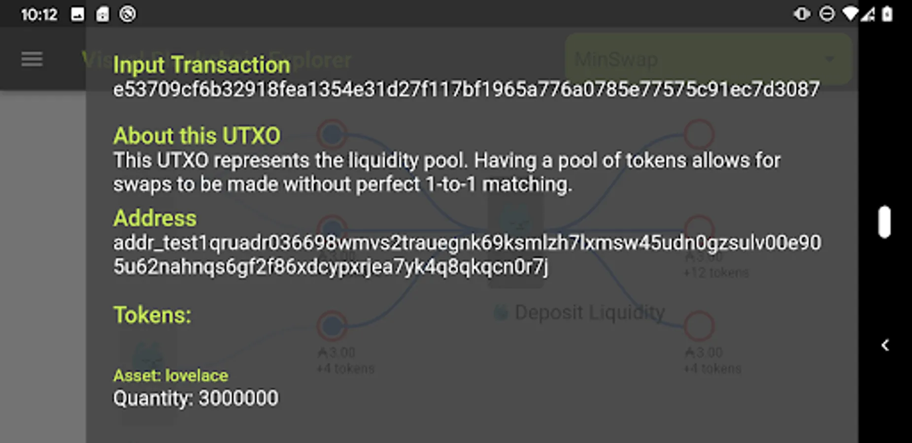 This prototype application can be used to explore Cardano testnet transaction run by MinSwap, Occam, and SundaeSwap during their testing phase. You can top on transactions to move up the blockchain, and tap on UTXOs to get more information about that UTXO and the tokens within.
