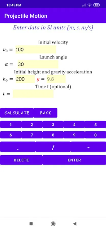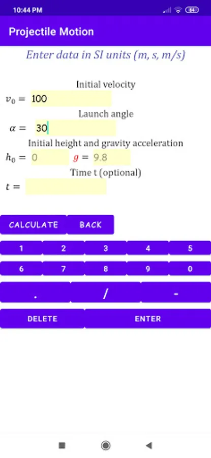 As a help, default values of the initial height (zero) and the acceleration of gravity (9.8 m / s2) are given, but these can be changed as desired.