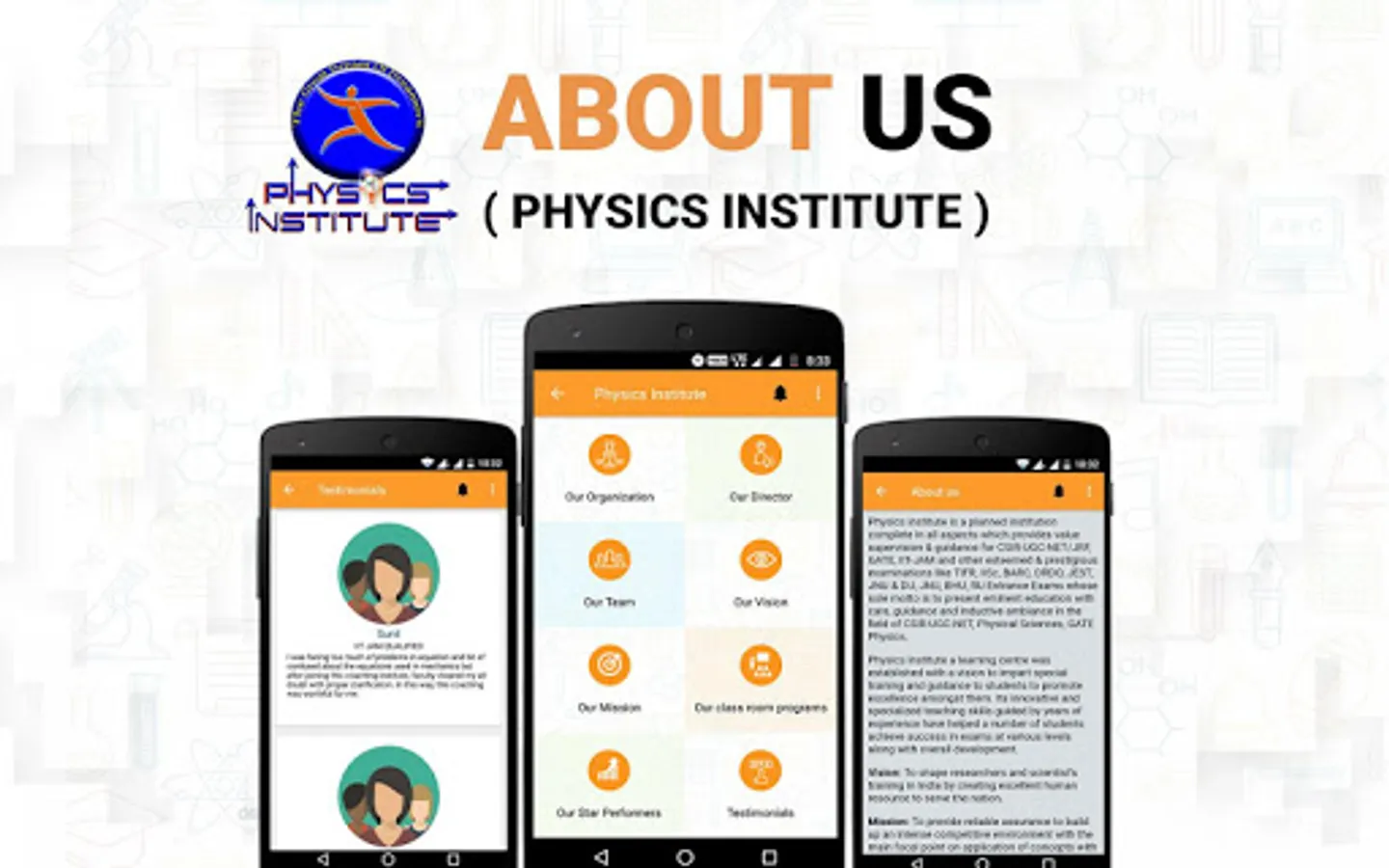 In Physics Institute App user can get each and every details about our institute, management, new batches, courses offered, total selections, toppers, vision & mission, testimonials, photo galleries, contact address, phone numbers, enquiries etc.