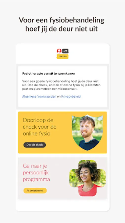 Need physio? You don't have to leave the house for that. Do the check, schedule a video consultation with a recognized physiotherapist and receive a personal exercise program with handy exercise videos. Just online. Wherever you are.