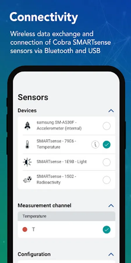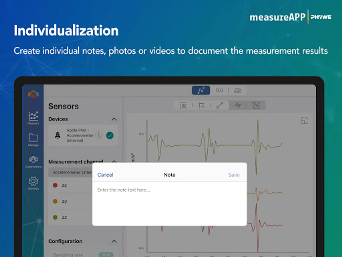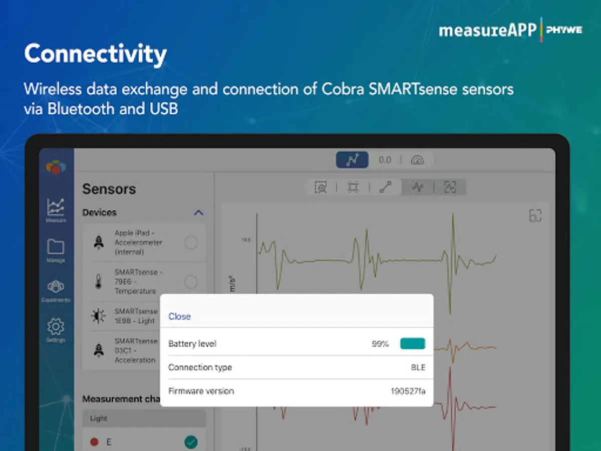PHYWE measureAPP is THE app for simple and fast data logging in your digital natural science class. In combination with our Cobra SMARTsense sensors we offer you an intuitive, simple and modern overall solution that leaves nothing to be desired.