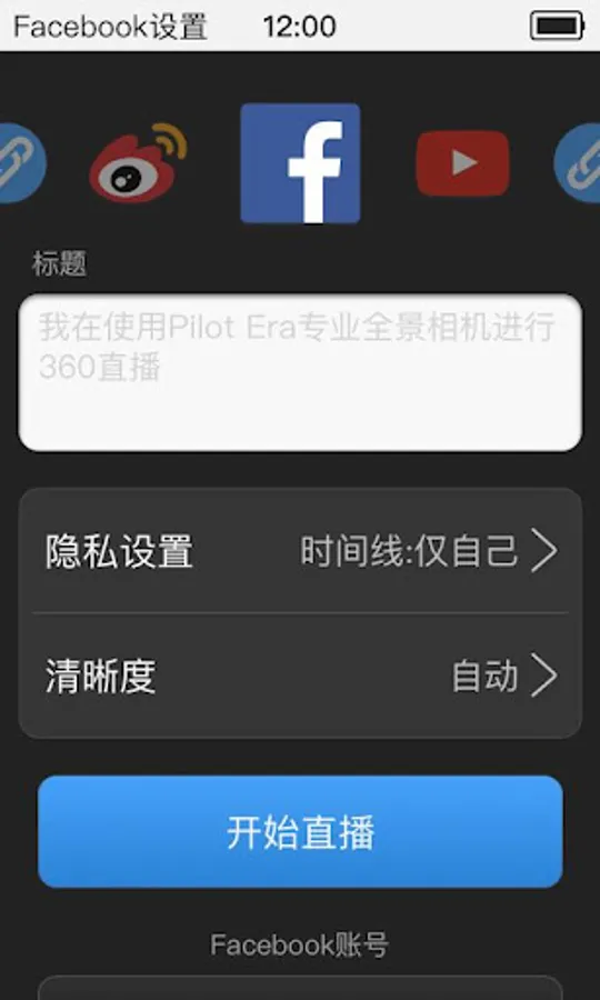 Pilot Live panorama live app, used in conjunction with Pilot panoramic camera, do panoramic live. You can live to Facebook, Weibo, YouTube, rtmp and other platforms.